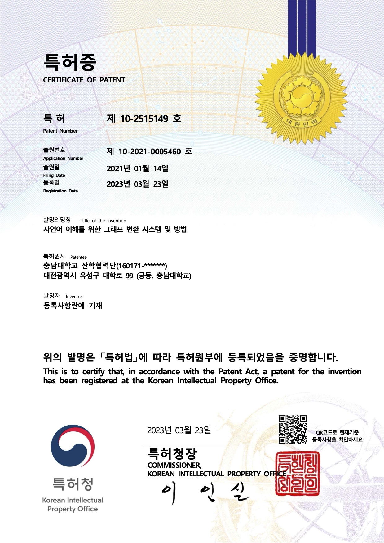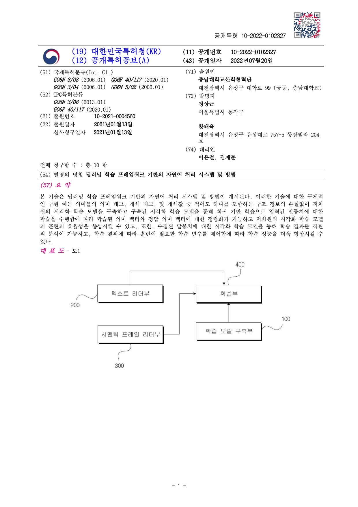| 29 | 핵심연구 | PatentQA: 트랜스포머 모델을 이용한 특허 질의응답 신경망 검색시스템 | Journal of KIISE | 2023.04 | |